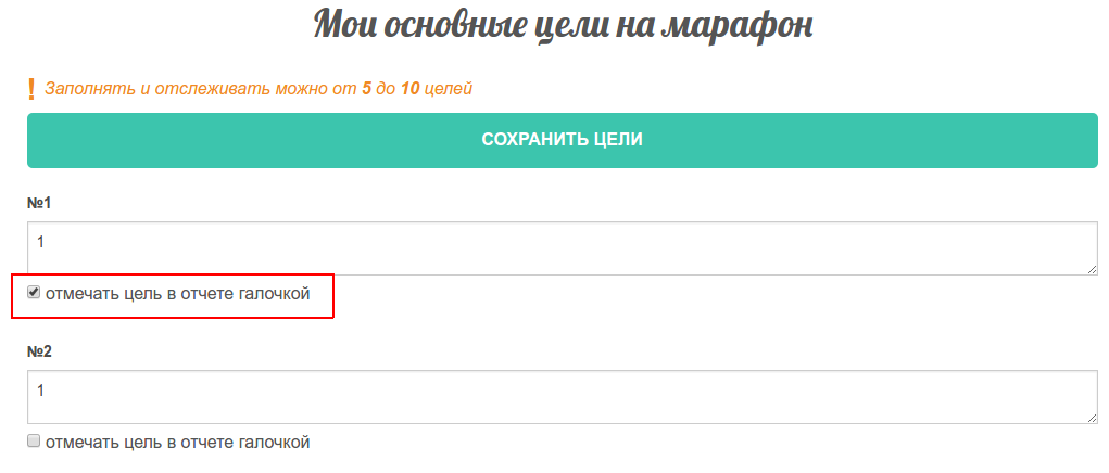 Чтобы была возможность в ежедневном отчете писать развернутый комментарий к своим целям необходимо зайти в раздел «Мои основные цели» в меню марафона:
